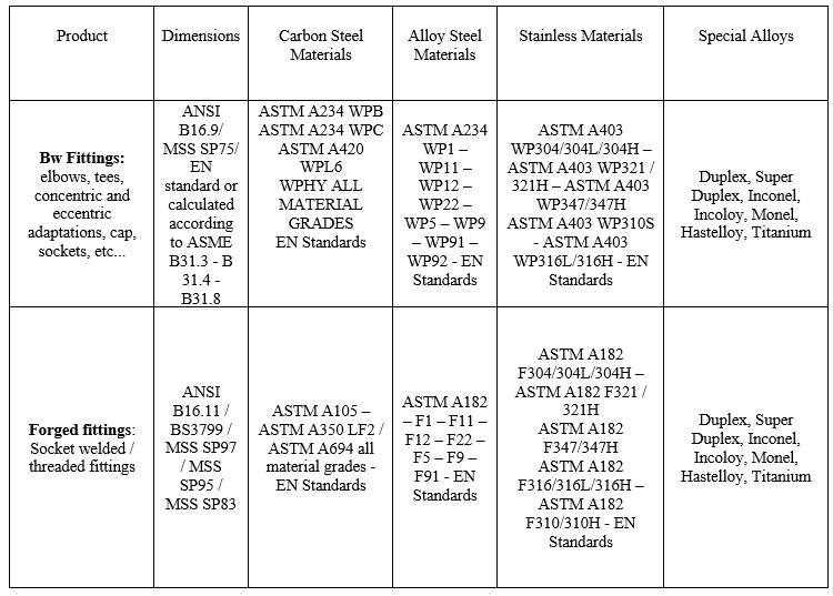 We supply BW Fittings, in particular elbows (and long radius elbows), Tees, concentric and eccentric reductions, caps, socket welded / threaded fittings fittings in all the materials available for the different applications.