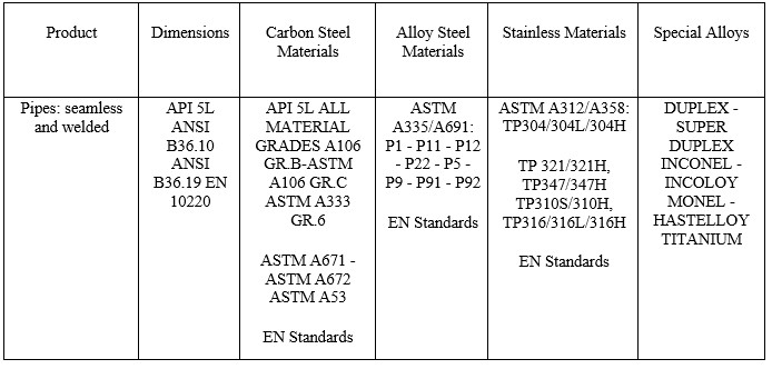We supply Steel or Carbon pipes, both seamless and welded, for different purposes, for low or high temperatures, medium or high pressures, for industrial plant appliances, suitable also into corrosive environment. They fulfill the ASME, EN and PED conformity requirements.